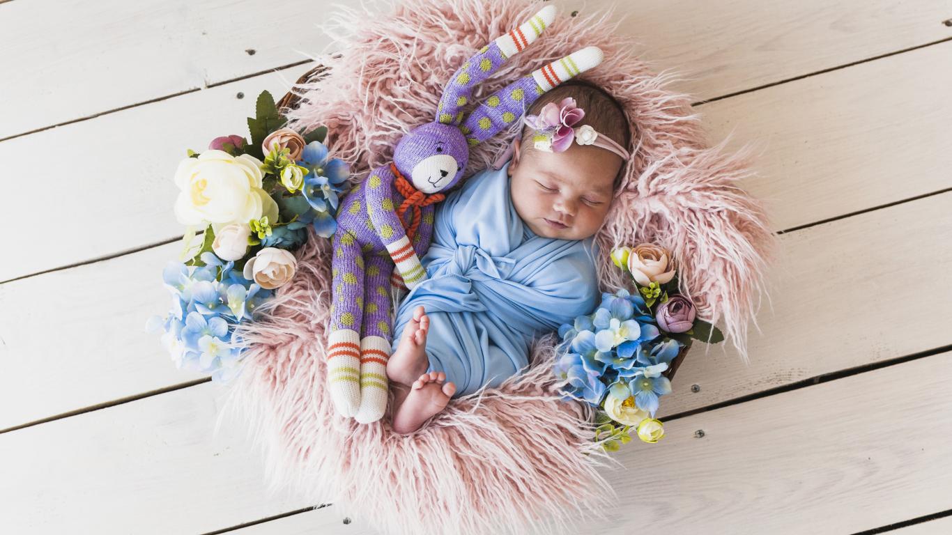 Wallpaper Sleeping baby with a toy in a basket