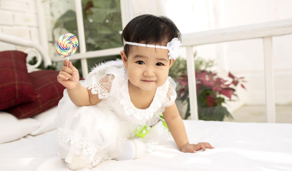 Wallpaper Little girl in a white dress with a lollipop in hand