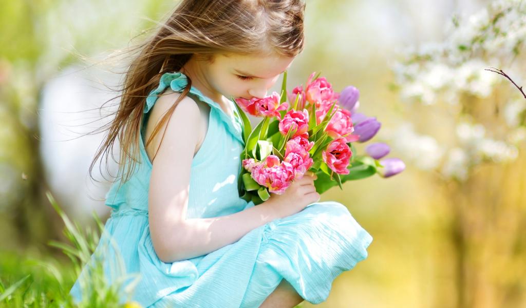 Wallpaper Beautiful cute blue-eyed girl with a bouquet of pink tulips