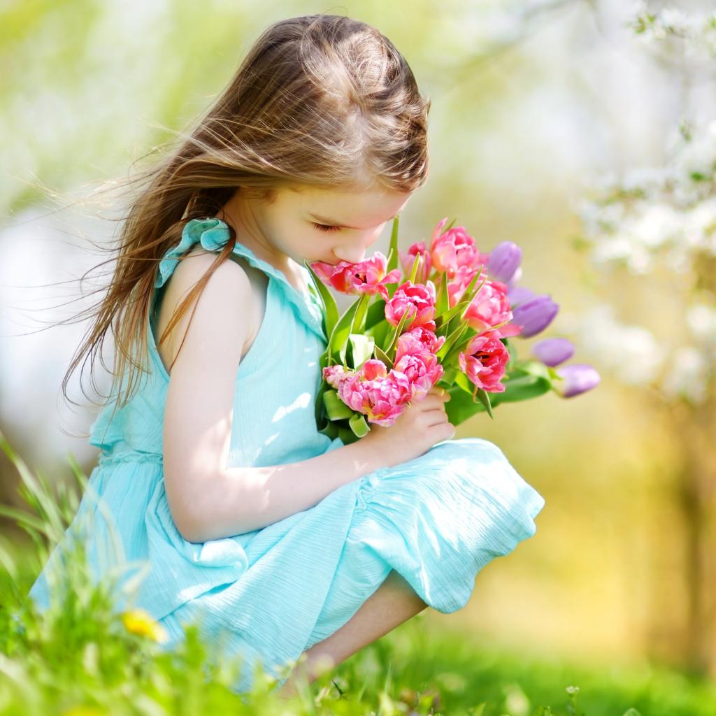 Wallpaper Beautiful little girl with a bouquet of tulips in the spring