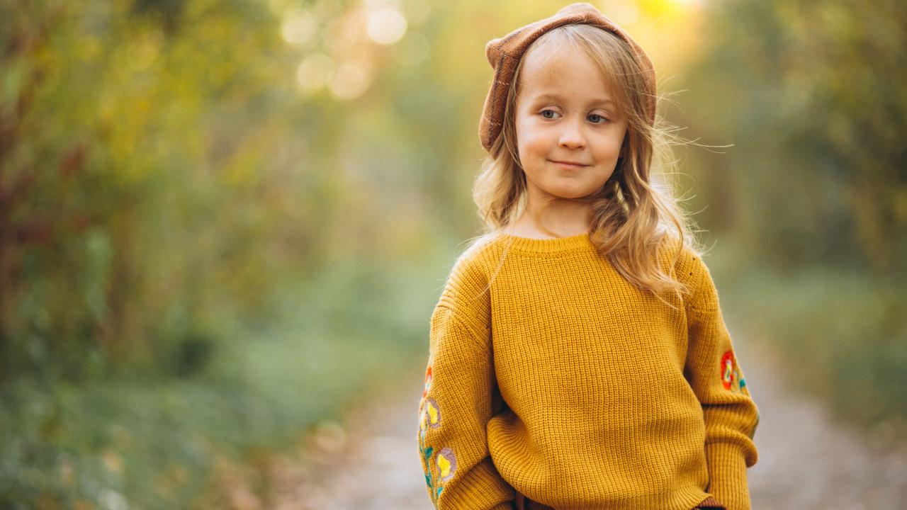 Wallpaper Little girl in a sweater walks in the forest
