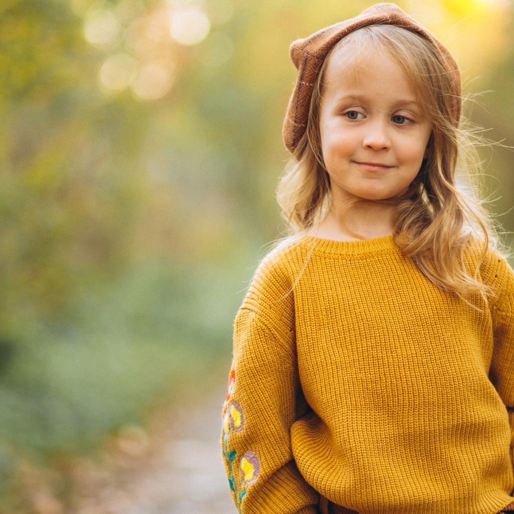 Wallpaper Little girl in a sweater walks in the forest