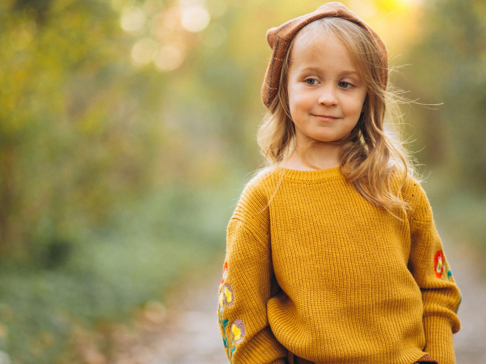 Wallpaper Little girl in a sweater walks in the forest