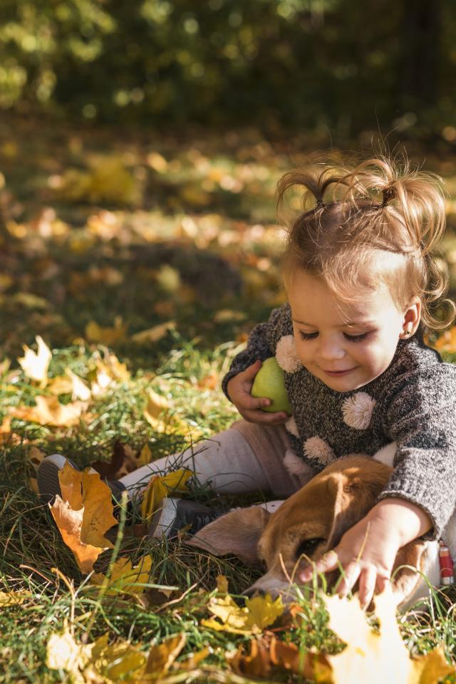 Wallpaper Little girl with a dog in the autumn forest