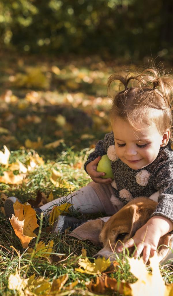 Wallpaper Little girl with a dog in the autumn forest