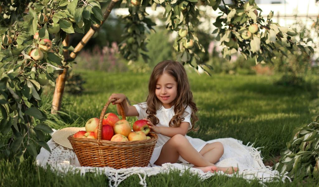 Wallpaper Little girl sits with a basket with apples on the grass