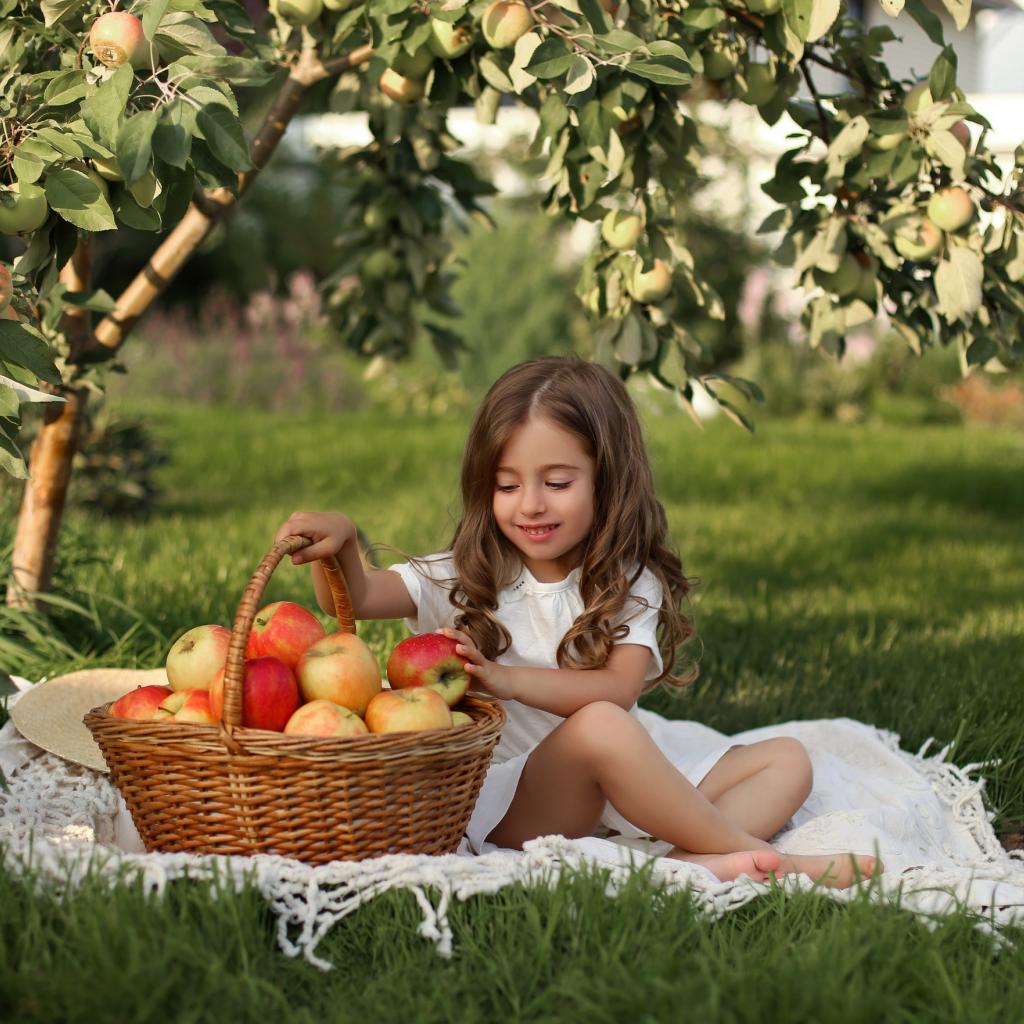Wallpaper Little girl sits with a basket with apples on the grass