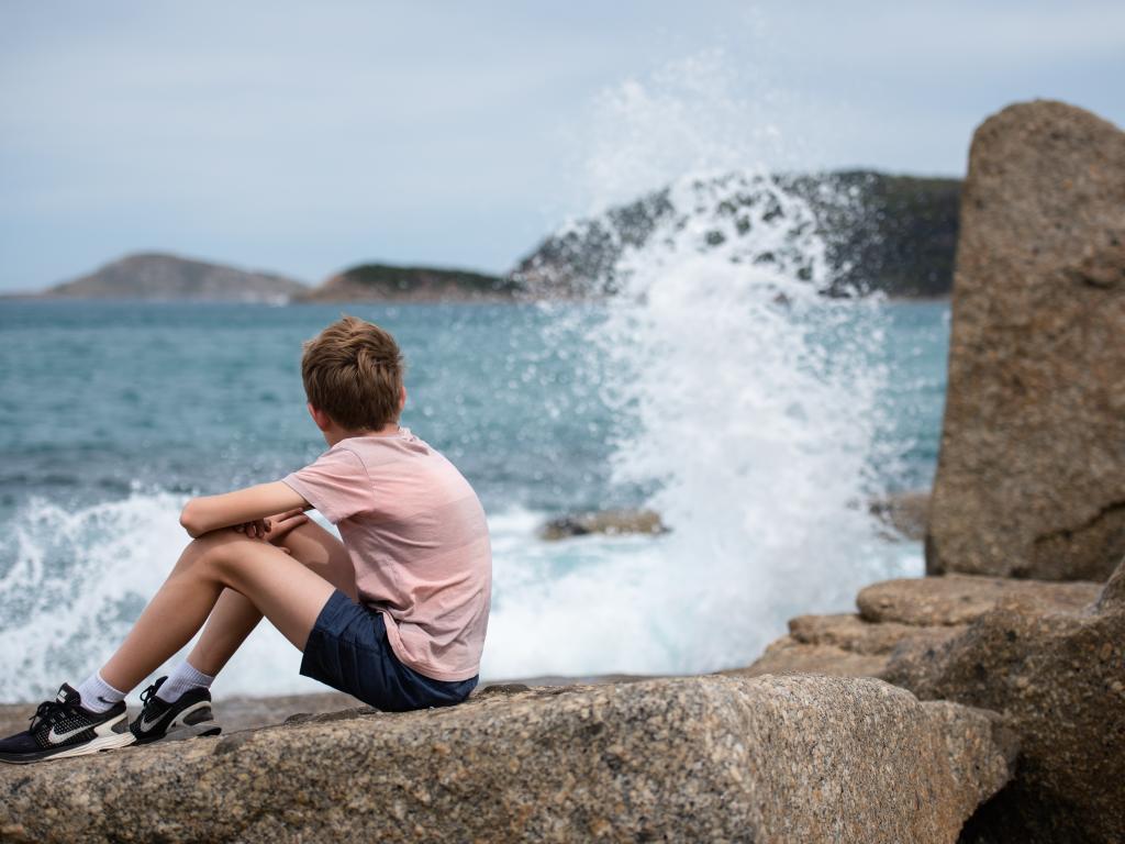 Wallpaper A boy sits on stones by the raging sea
