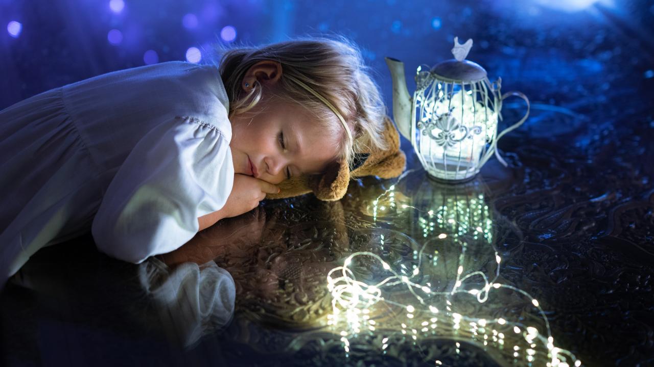 Wallpaper Cute little girl in a white dress sleeps on the table