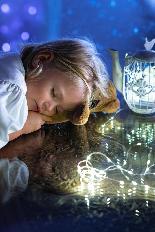 Wallpaper Cute little girl in a white dress sleeps on the table