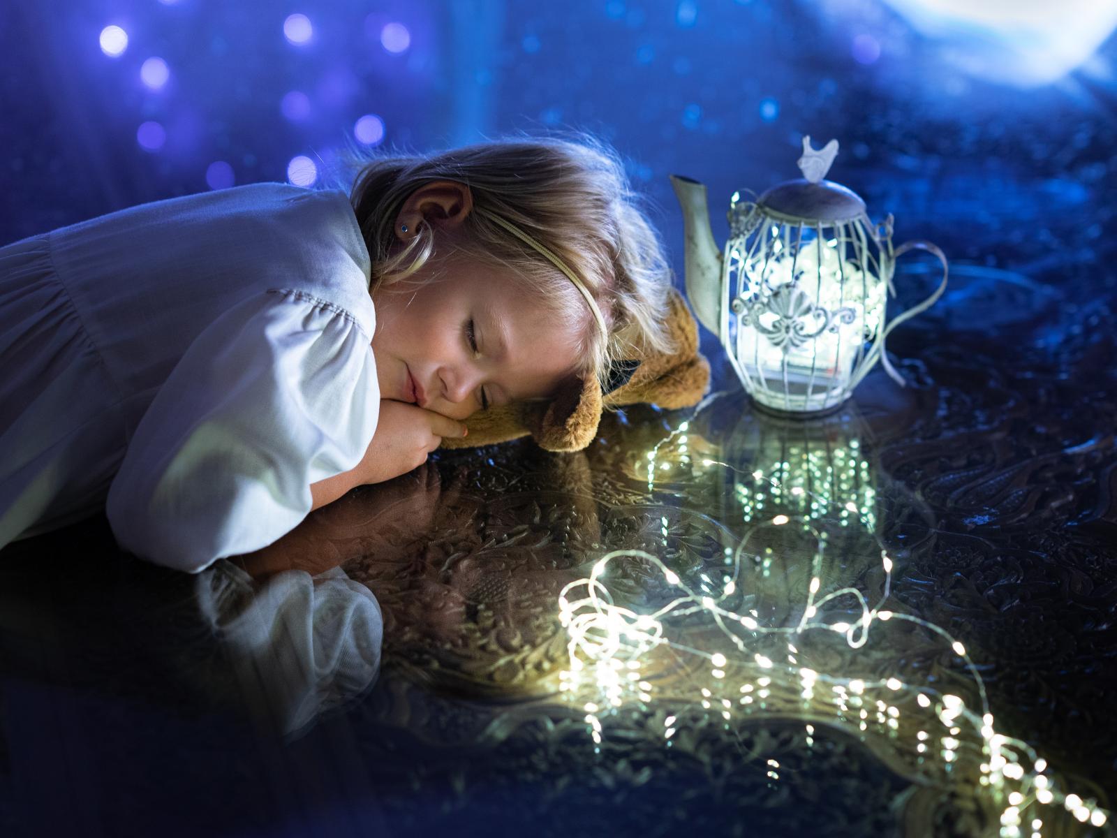 Wallpaper Cute little girl in a white dress sleeps on the table