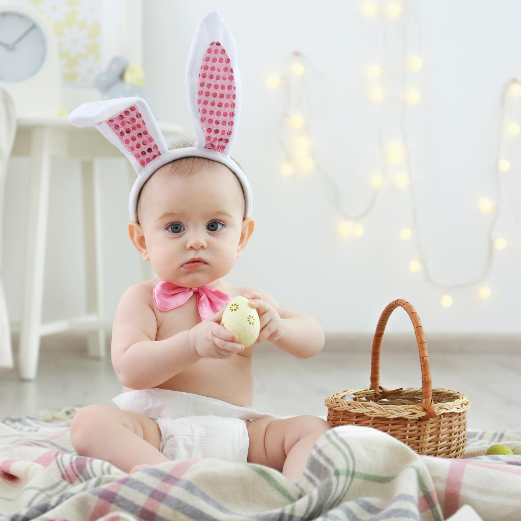 Wallpaper Cute baby with ears on his head sits with Easter eggs.