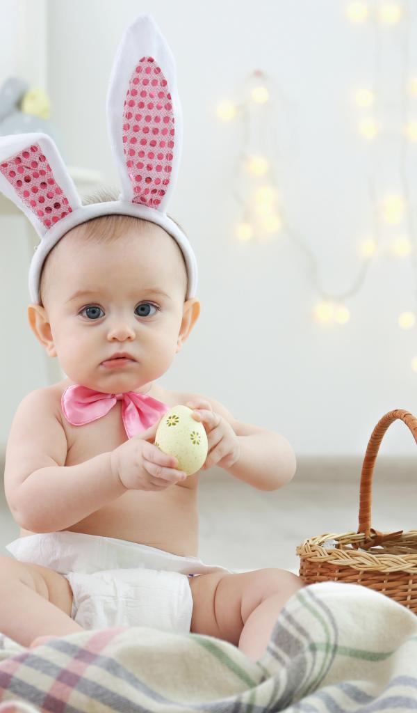 Wallpaper Cute baby with ears on his head sits with Easter eggs.