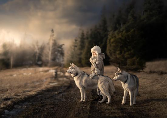 Wallpaper Little girl with husky dogs in the forest