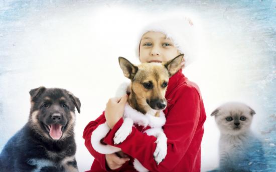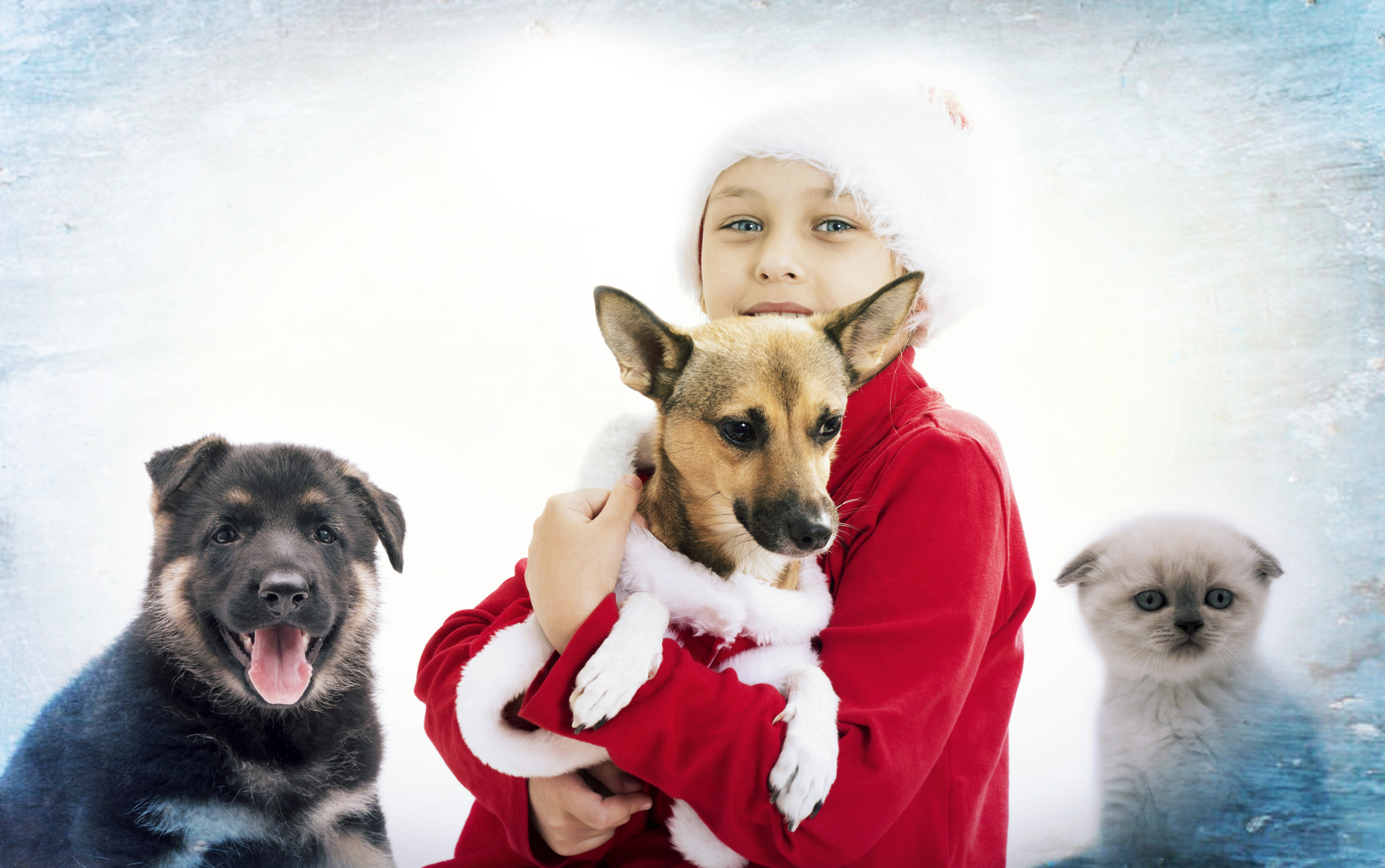 Wallpaper Blue-eyed girl with dogs and a kitten