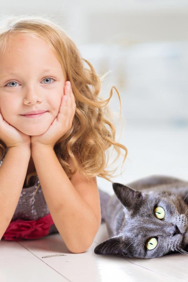Wallpaper Little cute blue-eyed girl lies on the floor with a cat