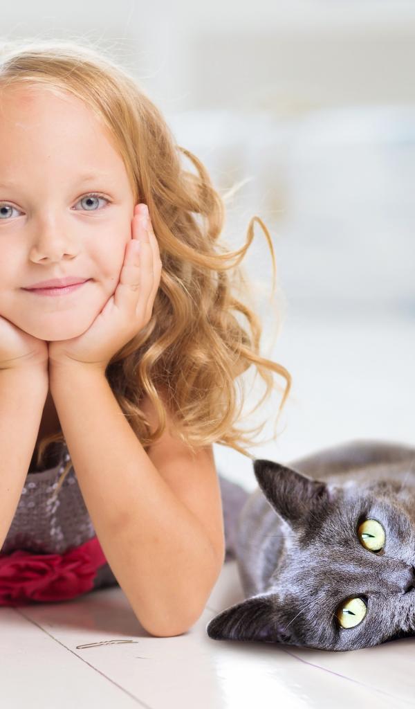Wallpaper Little cute blue-eyed girl lies on the floor with a cat