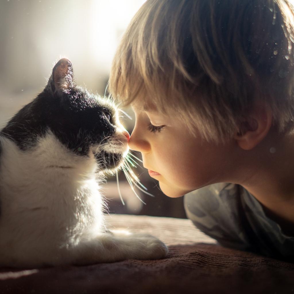 » Wallpaper Little boy lies with a cat