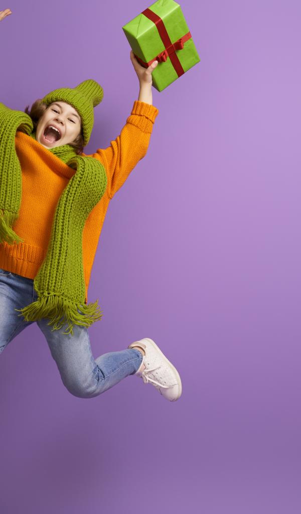 Wallpaper Happy girl with a gift in hand on a purple background