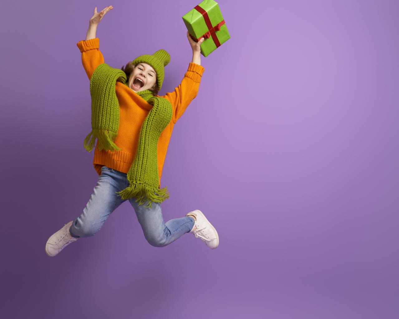 Wallpaper Happy girl with a gift in hand on a purple background
