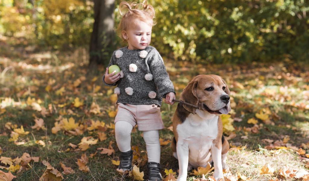 Wallpaper Little girl walking a dog in autumn park