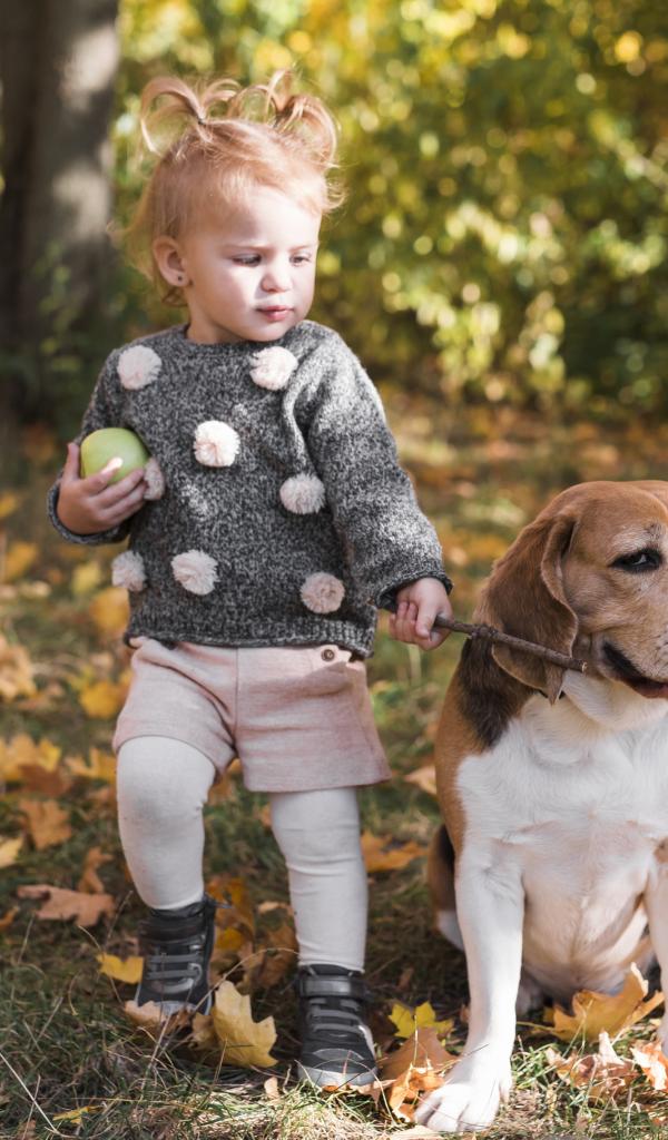 Wallpaper Little girl walking a dog in autumn park