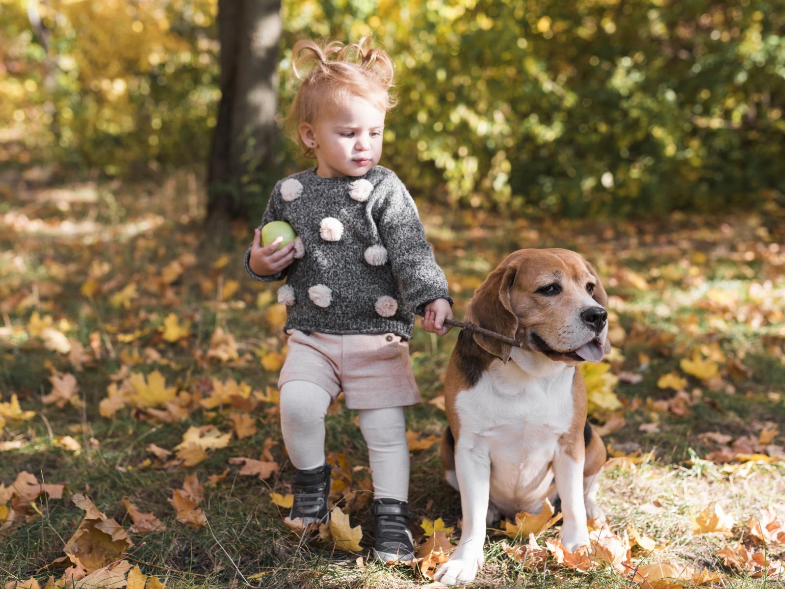 Wallpaper Little girl walking a dog in autumn park