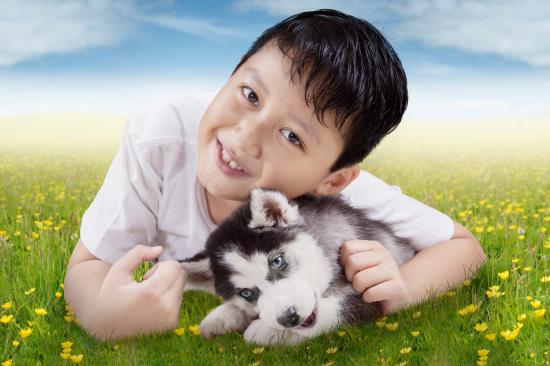 Wallpaper Little boy with a husky puppy on green grass