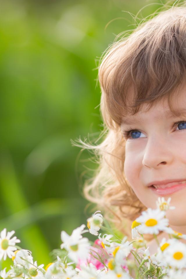 Wallpaper Smiling girl with a bouquet of daisies