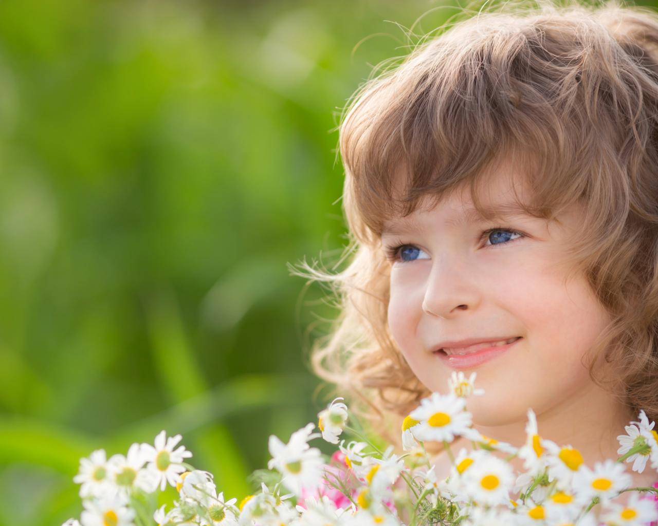 Wallpaper Smiling girl with a bouquet of daisies