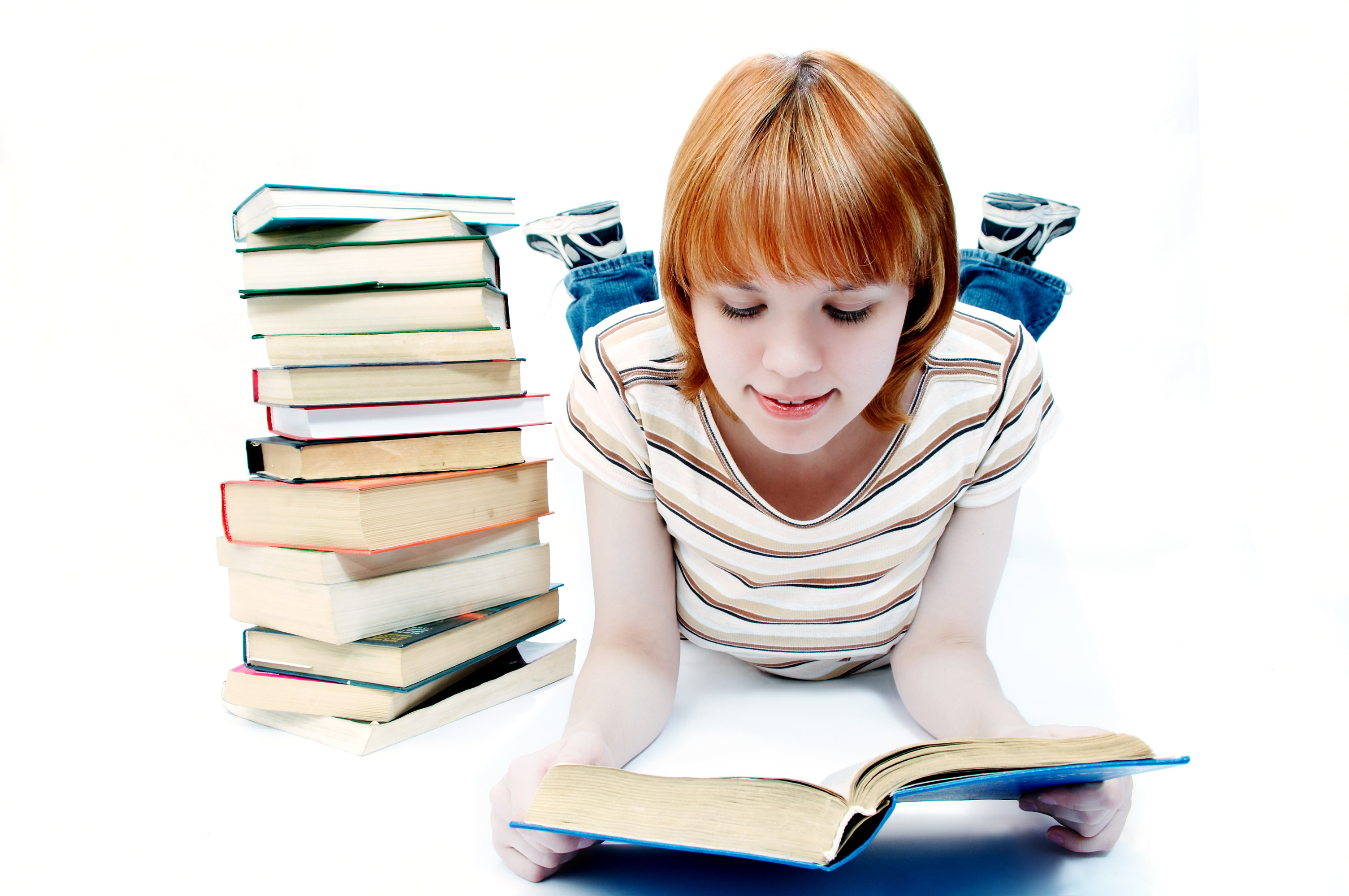 Wallpaper Red-haired girl schoolgirl reads books on a white background