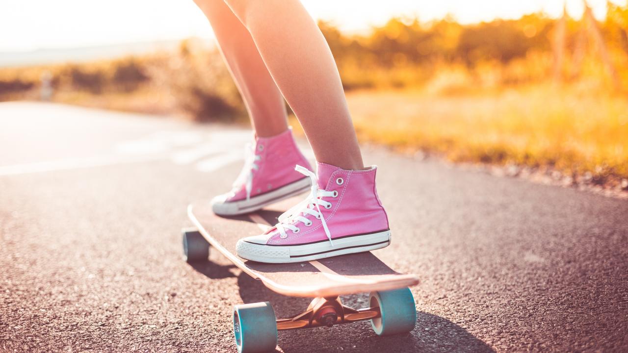 Wallpaper Girl in pink sneakers rides on a skateboard.