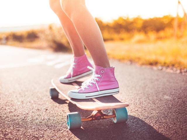 Wallpaper Girl in pink sneakers rides on a skateboard.