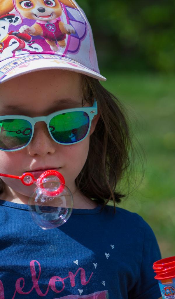 Wallpaper Little girl in glasses with soap bubbles