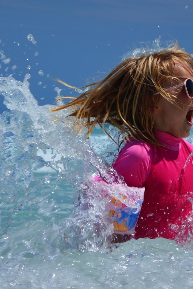 Wallpaper Cheerful little girl swimming in the sea in summer