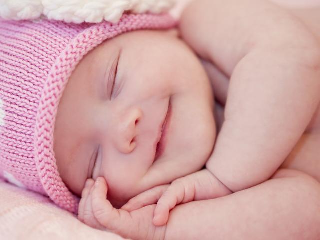 Wallpaper Smiling sleeping baby in a white knitted hat with a flower