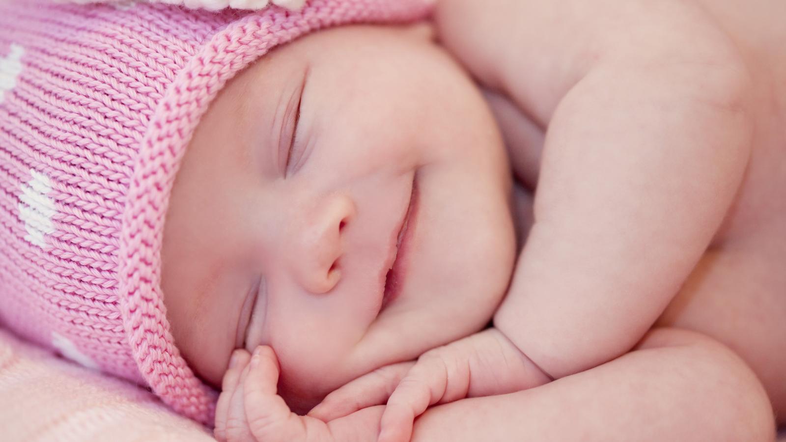 Wallpaper Smiling sleeping baby in a white knitted hat with a flower