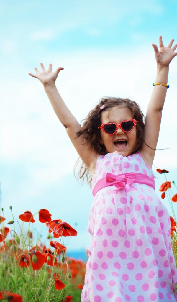 Wallpaper Happy little girl in a dress on a field with poppies