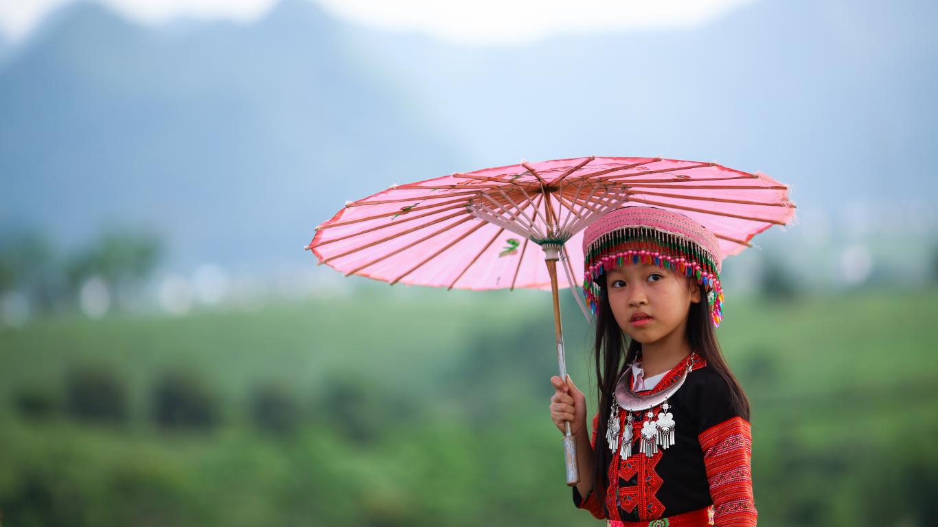 Wallpaper Little asian girl with pink umbrella