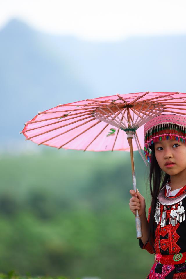 Wallpaper Little asian girl with pink umbrella