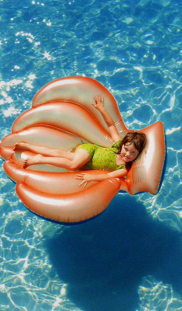 Wallpaper A little girl is swimming in the pool with a big red dog