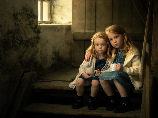 Wallpaper Two little sisters drink cocoa on the steps of the house
