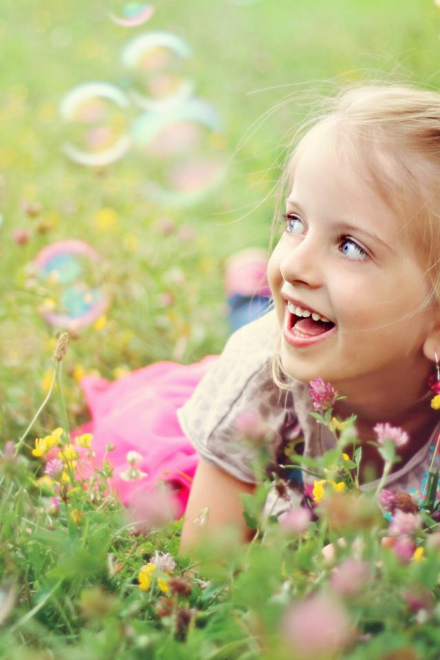 Wallpaper Cheerful girl lies on the grass with soap bubbles
