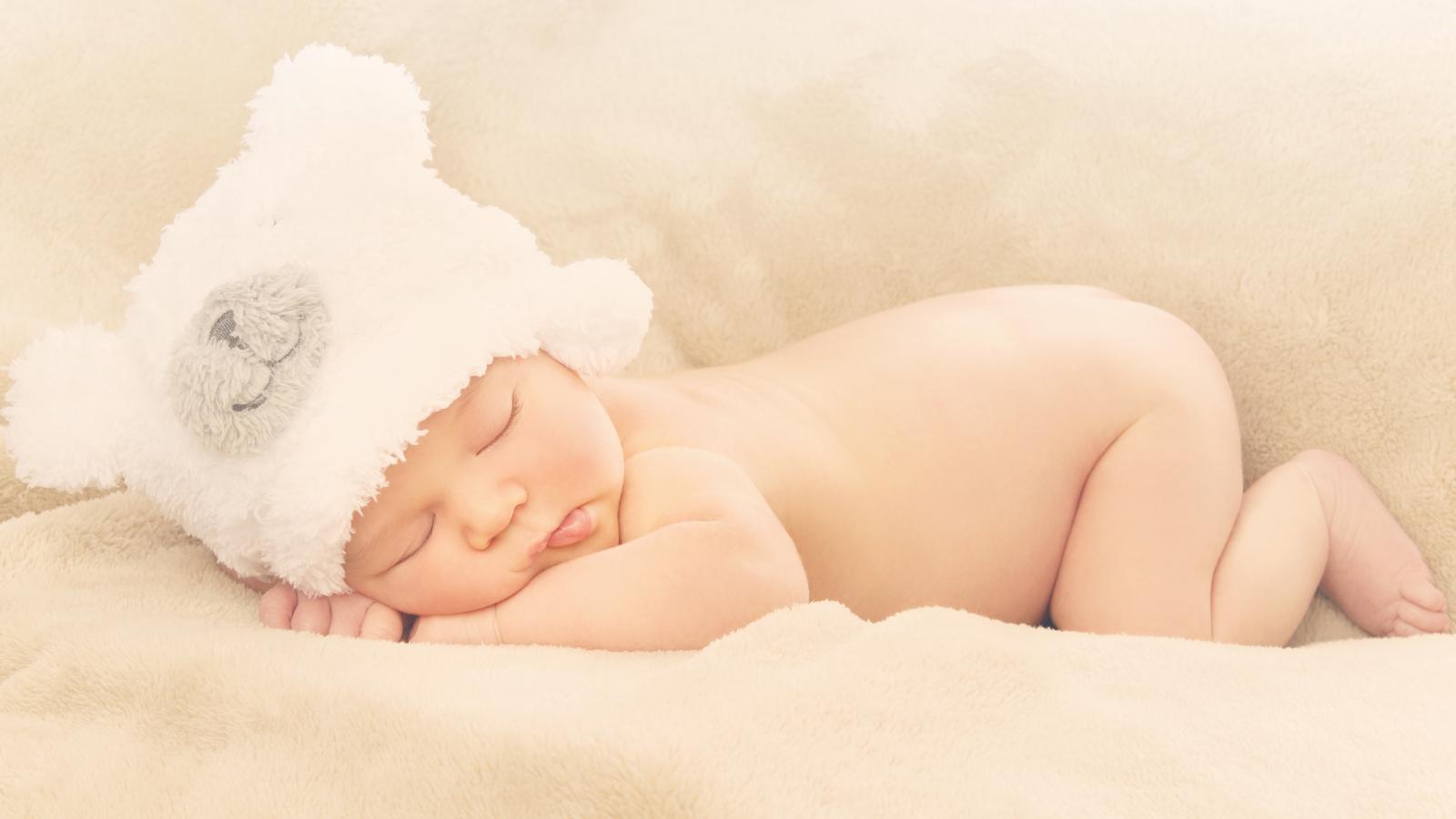 Wallpaper A baby with a white hat sleeps in bed