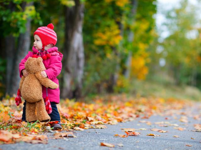 Wallpaper Little girl with a teddy bear on the road in autumn