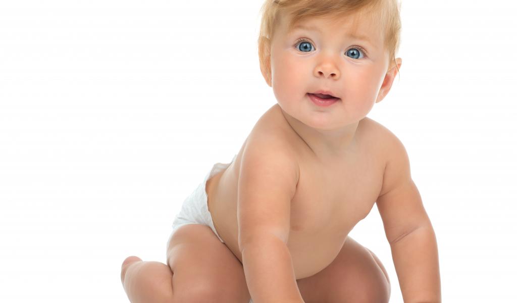 Wallpaper Little blue-eyed baby with fruit on a white background
