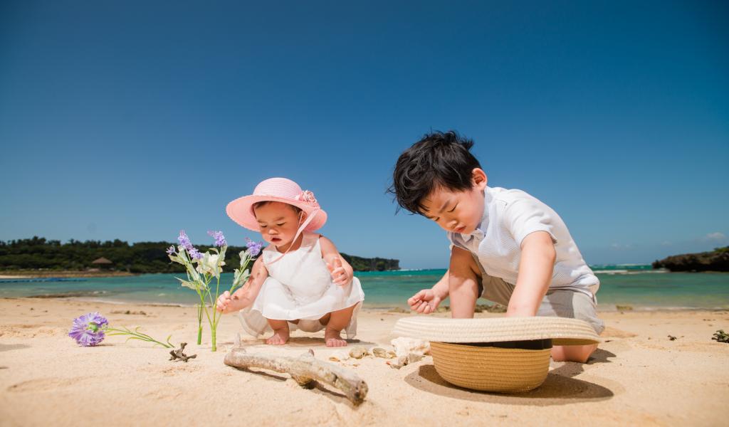 Wallpaper Little Asian children play on the sand by the sea