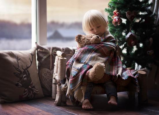 Wallpaper Little girl hugs a bear near the fir