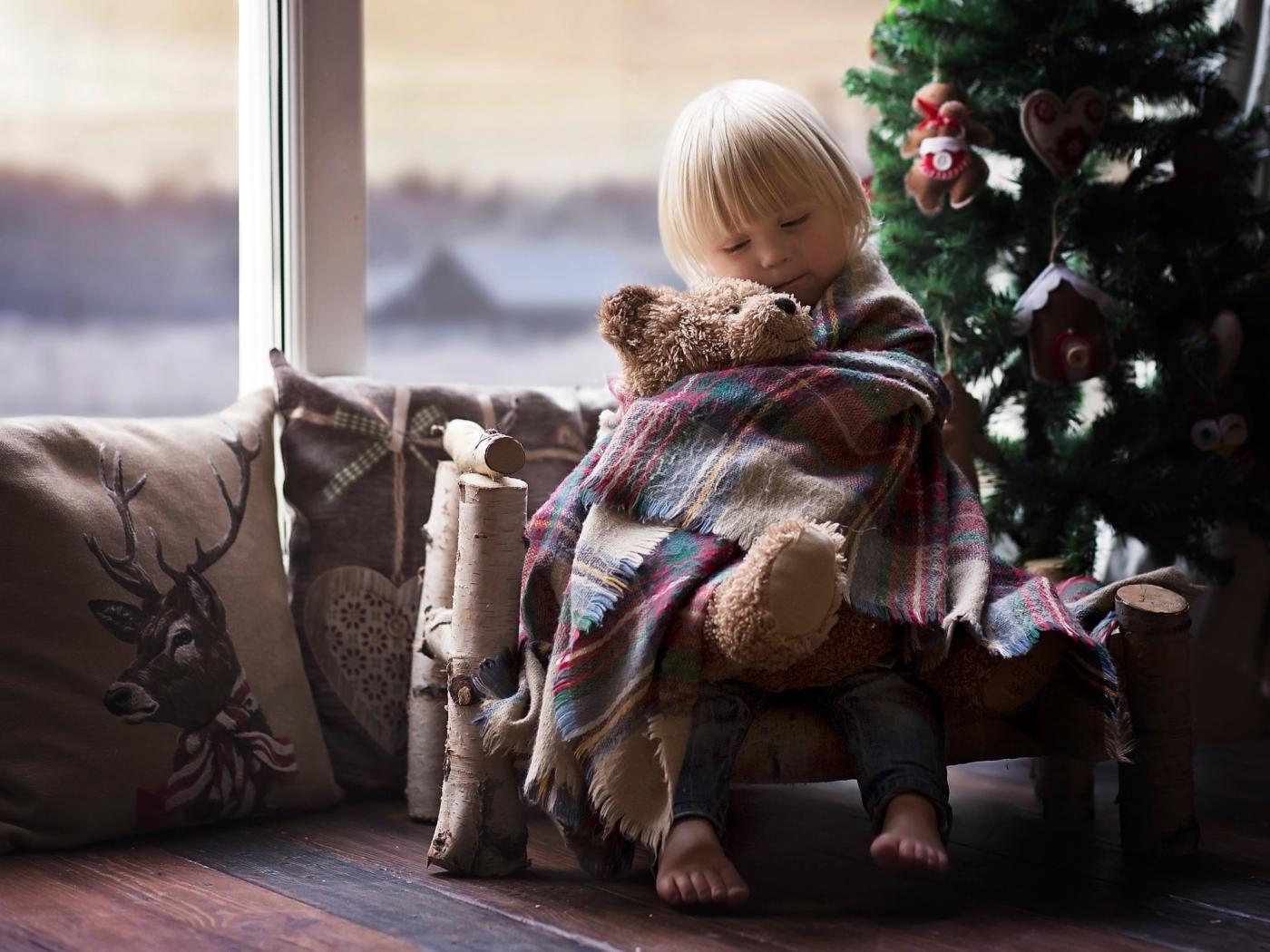 Wallpaper Little girl hugs a bear near the fir