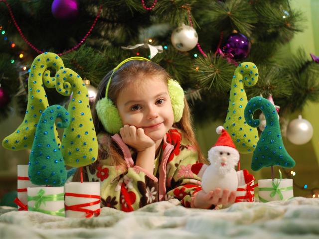 Wallpaper Little girl with toys under the tree